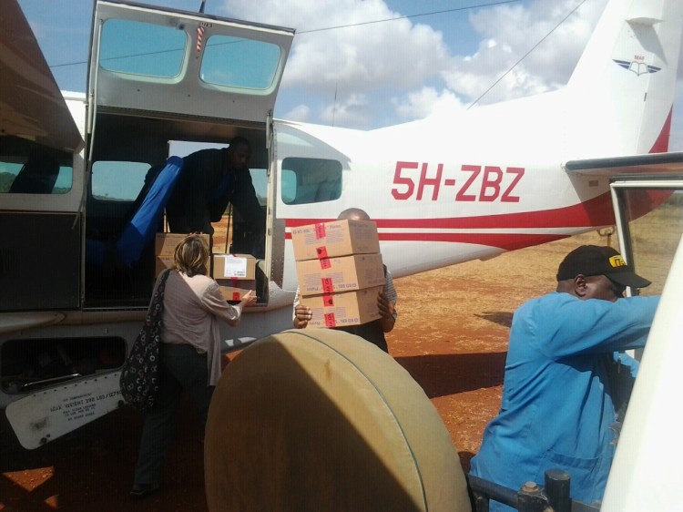 Frakten til Mal-ed lastes av i Haydom. I ettermiddag flyr jeg dem tilbake til Moshi igjen.